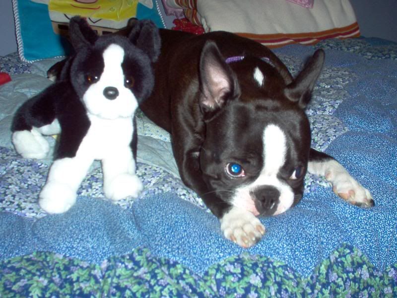 Hey everyone! Today is Violets 1 year old birthday! I don't know how some of you parents out there handled your baby's first bday, but I'm in pieces. I don't want her to grow up. I want her to stay a puppy forever! But she got a new kong (which is in the freezer as we speak with peanut butter and broken doggie treats for dessert tonight) and I got her some dent-a-bones. At Target this week they have these polo shirts I in pink and orange, pink, and black. She would've looked so cute in the pink and orange....I just wish that they weren't $9.99. But she's have a good birthday so far. I'm going to post two pictures of her and her mini-me that I bought her because the Animal Haus next door to where I work is closing and I got it like 40% off! Enjoy!